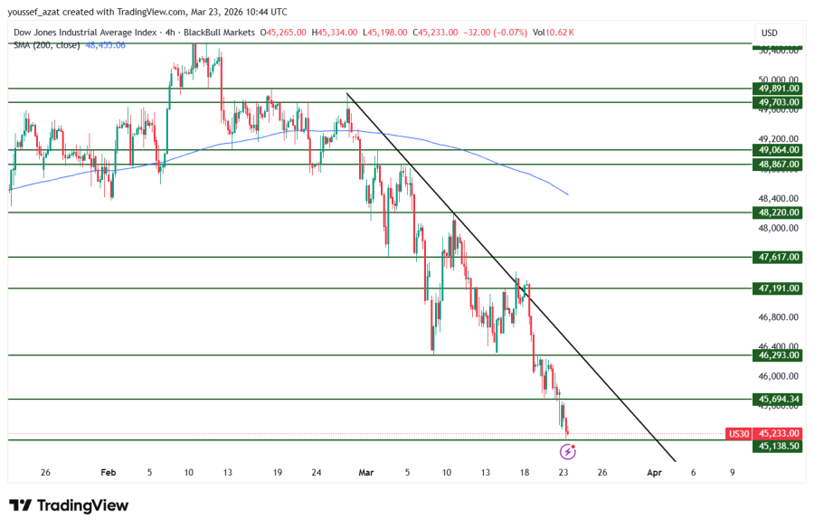 يتحرك مؤشر الداو جونز في إتجاه هابط على فريم الاربع ساعات اسفل خط إتجاه هابط من قمة الشهر الماضي و اسفل متوسط متحرك 200 ليكون متوقع للمؤشر وصوله لمستويات 45000 ومن ثم مستويات 44700