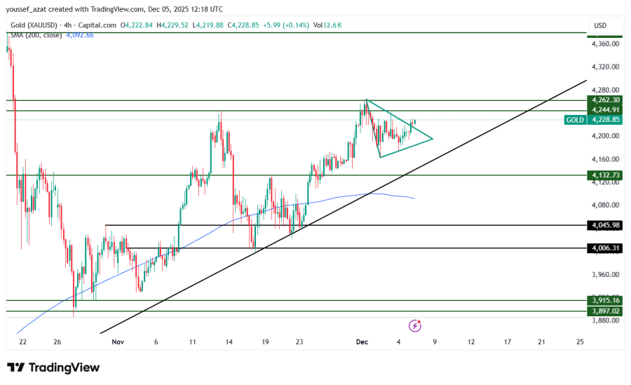 With a breakout from the symmetrical triangle shown above, gold is expected to continue its upward trend towards the resistance levels of 4245-4265 and then the 4300 level.