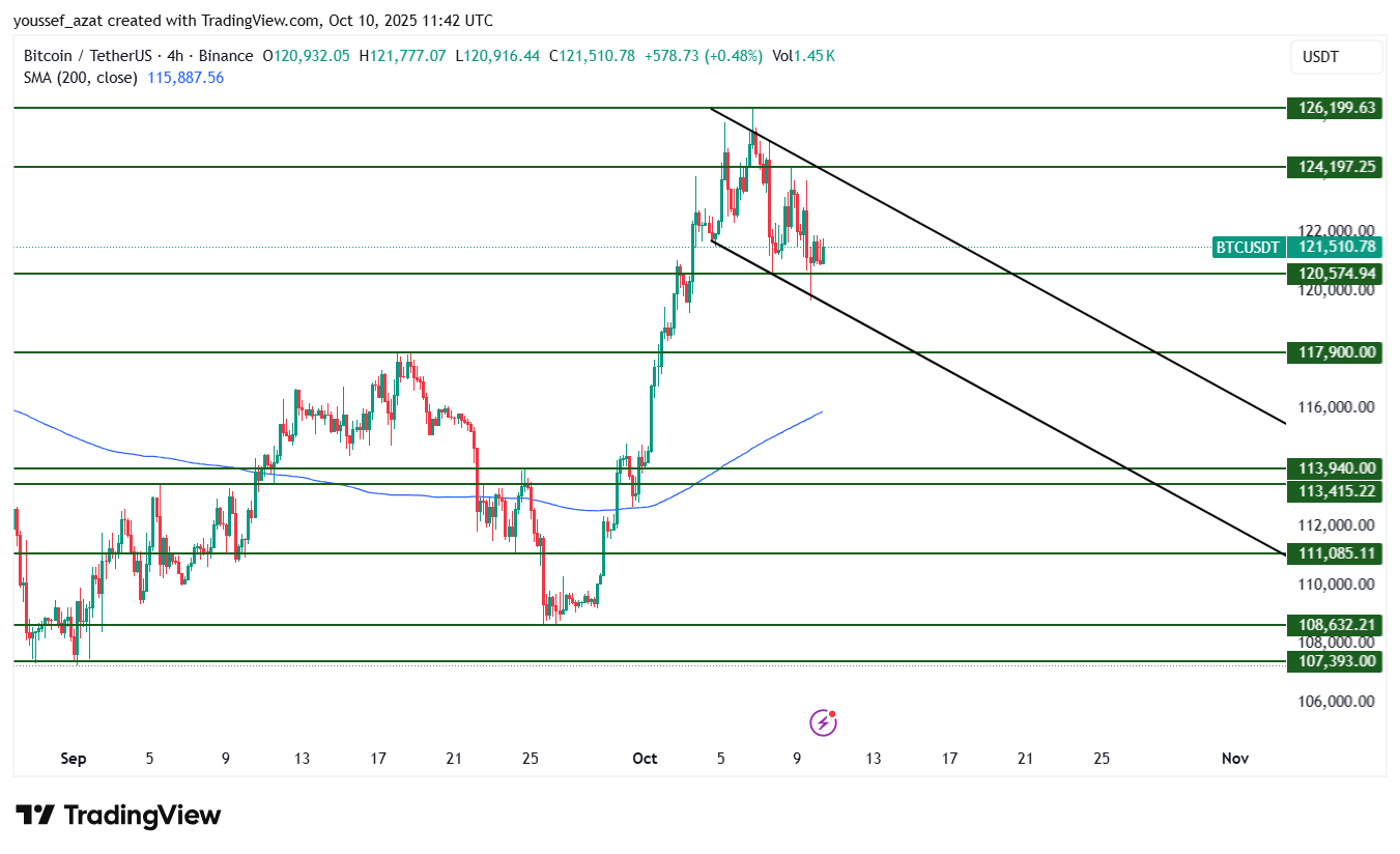 يتحرك البيتكوين في إتجاه صاعد من قاع الشهر الماضي أعلى متوسط متحرك 200 على فريم الأربع ساعات وفوق مستويات الدعم 120000