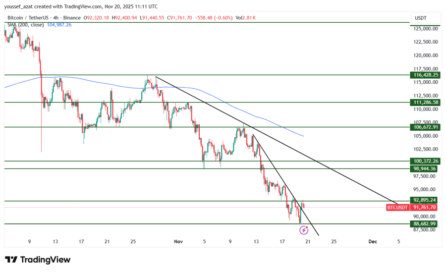 Bitcoin is moving in a downtrend below the 200-period moving average on the four-hour timeframe and below a descending trendline from last month's high.