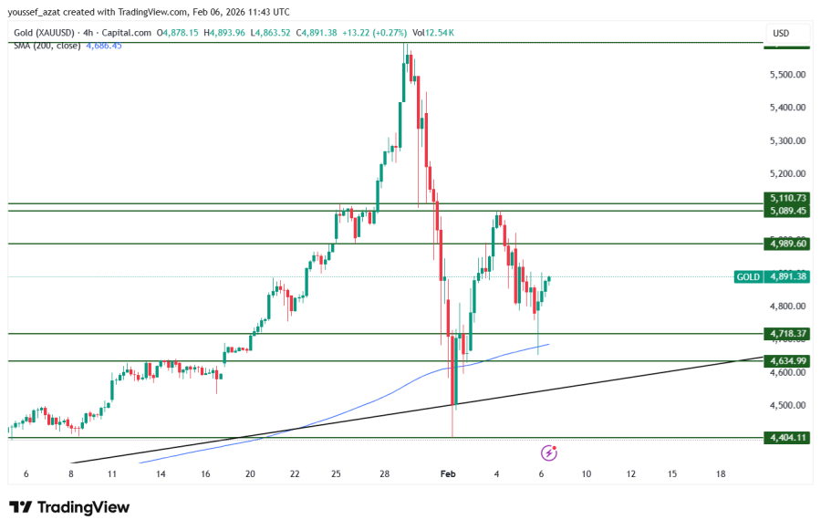 Gold managed to rise again from the support level of 4400, from the upward trend line from the low of last August, and from the 200-period moving average on the four-hour timeframe, and is heading towards the resistance level of 4990.
