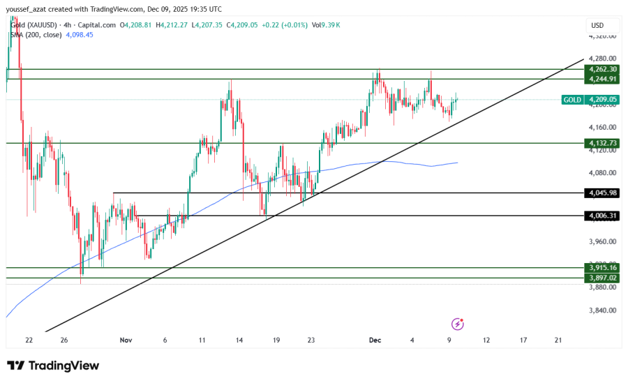 Gold remains stable above the key support levels of 4130-4160, above the 200-period moving average on the four-hour timeframe, and above the upward trend line from the low of last August.