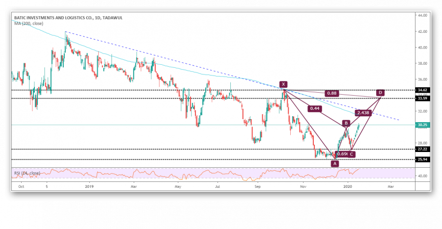 يكوّن السعر حاليا نموذج هارمونيك استباقي وهو bat بنسبة تصحيح 88% فيبوناتشي من الضلع xa واخترق السعر نقطة b لذلك من المتوقع استمرار الصعود ليصل لخط الاتجاه الهابط من قمة نوفمبر 2018 واذا استطاع اختراقها لأعلى سيتجه لمنطقة المقاومة التي تعتبر مستهدف نموذج الهارمونيك عند مستويات 33.60-34.65