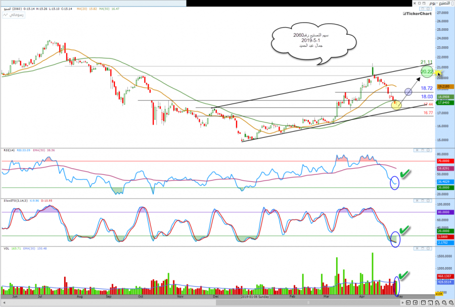 سهم التصنيع رقم2060فى السوق السعودى حيث نزل من القمه21.40 ليلامس 17.68 ويفرغ مؤشراته لذالك نتوقع ان يحافظ على الدعم17.42 ويبدأ الارتداد من هذا المستوى ويخترق18.03 ثم 18.72وباذن الله هدفنا سيكون 20.22 اختراقها ممكن يختبر سقف الترند عند21.11 سلبيه السهم كسر17.42