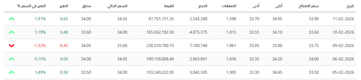 ويستعرض الجدول التالي أداء السهم خلال 5 جلسات سابقة.