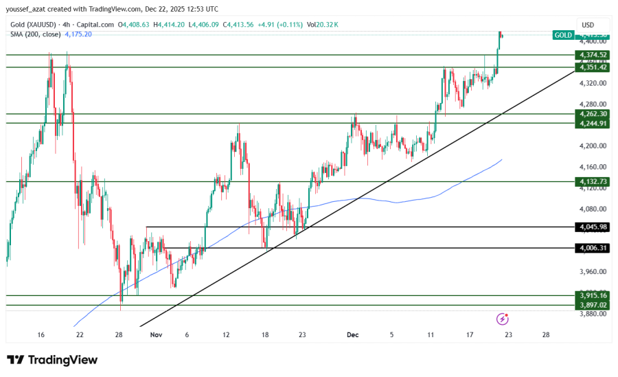 Gold has finally broken through the historic highs formed last October at 4380 and reached 4415. If it holds above 4380, gold is expected to continue its upward trend to 4450 and then 4500.