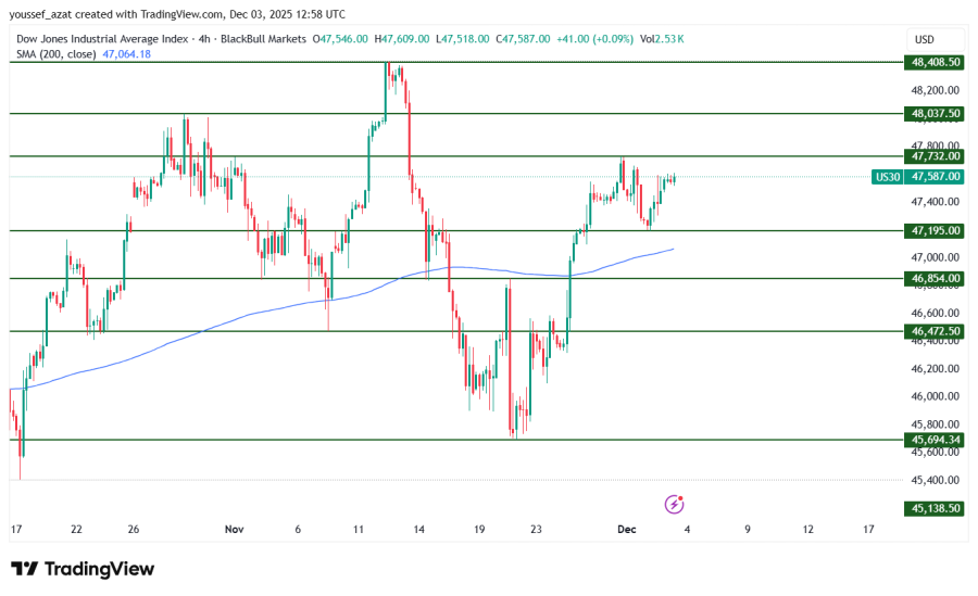 The index is trending upwards above the 200 moving average on the four-hour timeframe and above the support level of 47195. If it breaks through the resistance level of 4730, the index will then head towards the 48000 level and then the 48400 level.