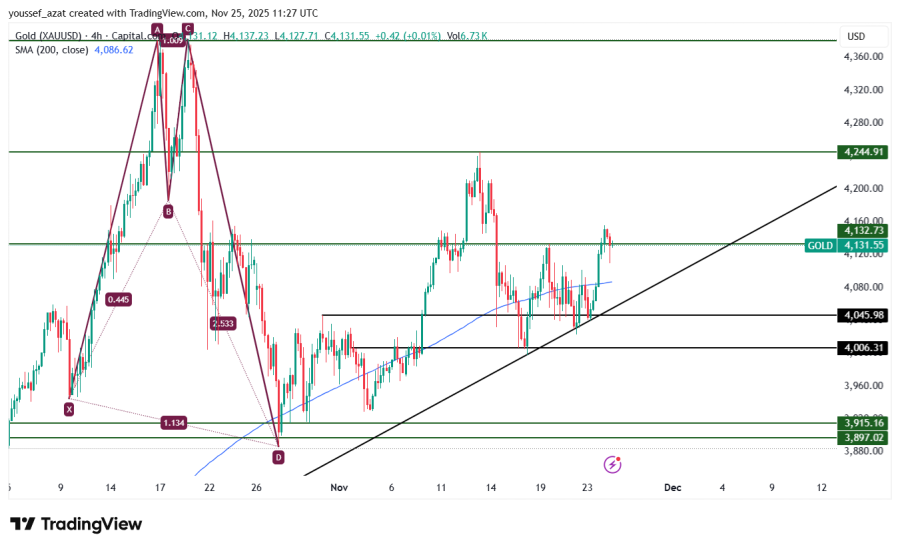 Gold rose from the pivotal support level of 4005, from the upward trend line from the September low, and from the 200-period moving average on the four-hour timeframe.